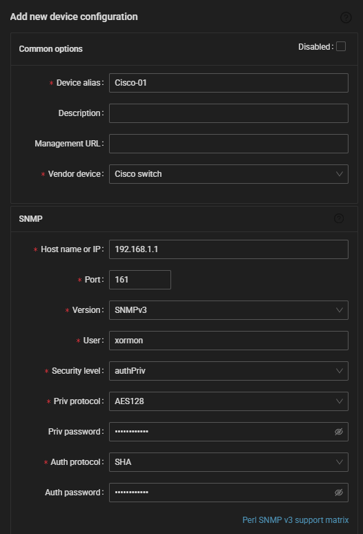 snmpwalk -v 3 -l authPriv -u xormon -A xorux4you -X xorux4you -a SHA -x AES 192.168.1.1 sysDescr SNMPv2-MIB::sysDescr.0 = STRING: "Cisco IOS Software [IOSXE] ...