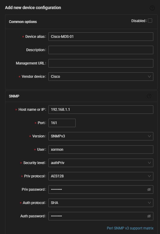 snmp-server user xormon auth sha xorux4you priv aes-128 xorux4you