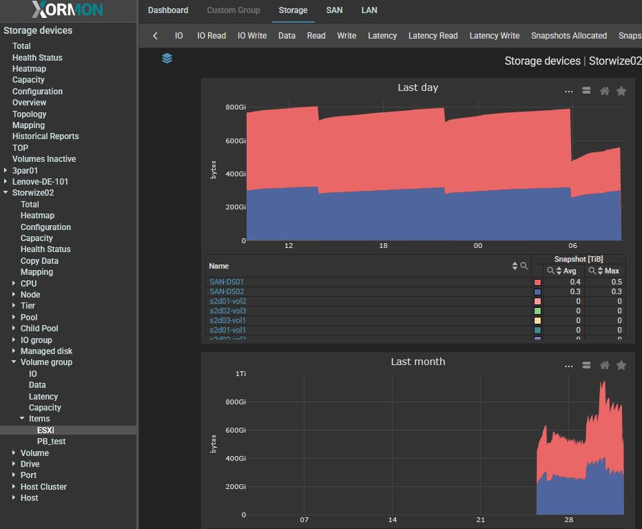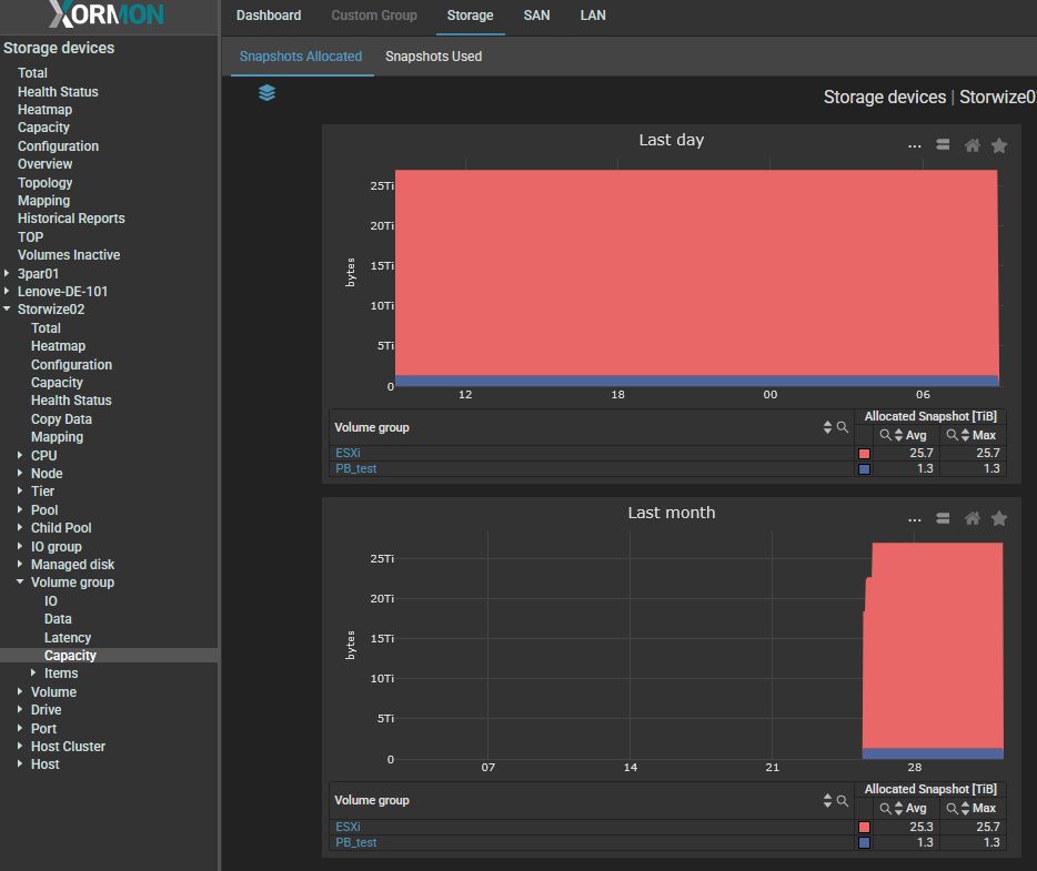 - Volume Group ➡ Items ➡ volume_group_name ➡ Snapshots Allocated, Snapshots Used and Volume Snapshots Used