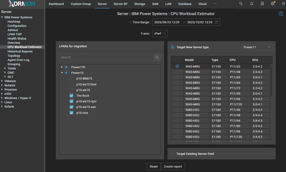 When you enter CPU Workload Estimator page, then simply select on the left panel target server and CPU pool and on the right panel select one or more LPARs which will be migrated. Then generate the graph. Default time range is 1 week.