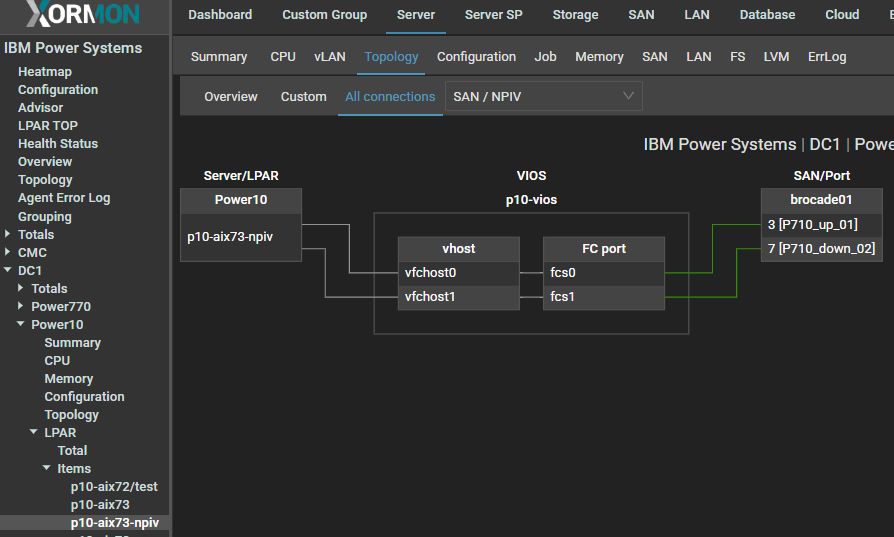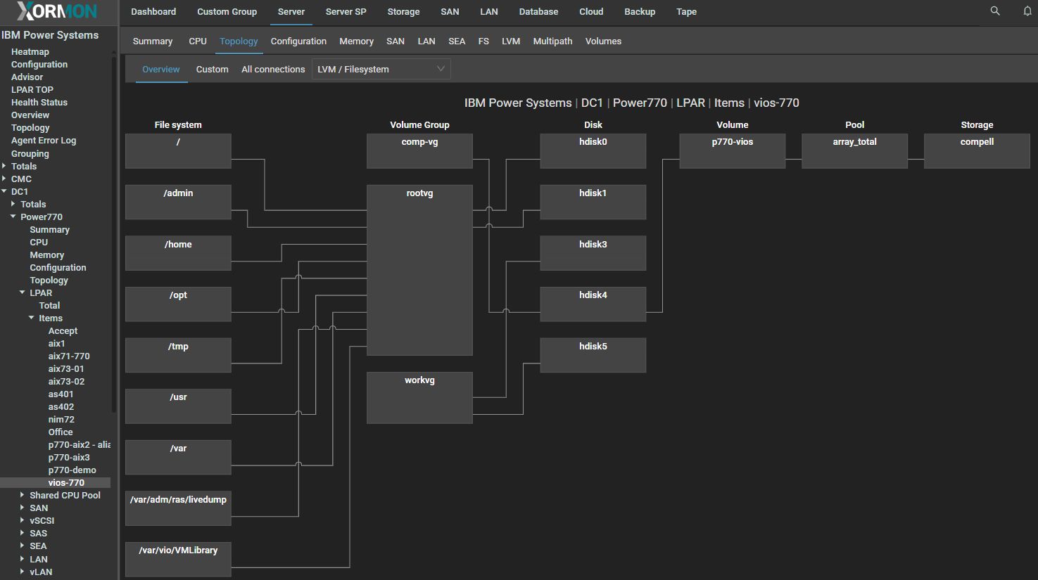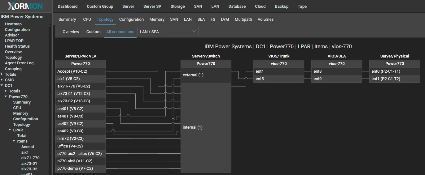 - UI → Server → IBM Power Systems → <server> → LPAR → Item → <LPAR name> → Topology (SAN, LAN, LVM)