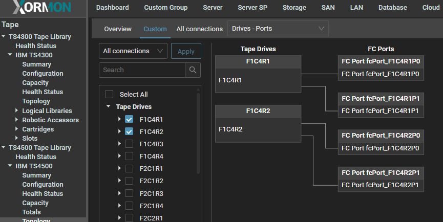 The Topology tool provides a graphical representation of logical connections between tape libraries and the SAN and internal drive architecture