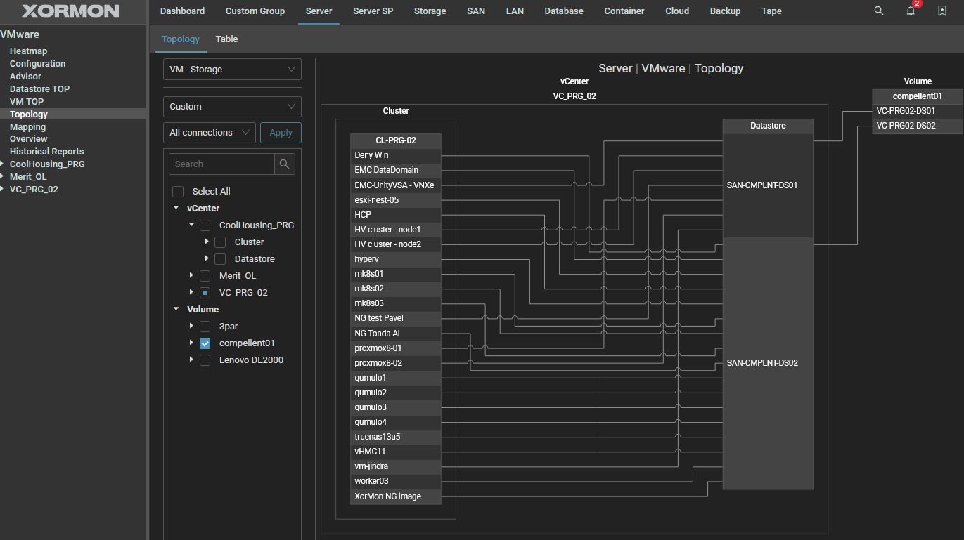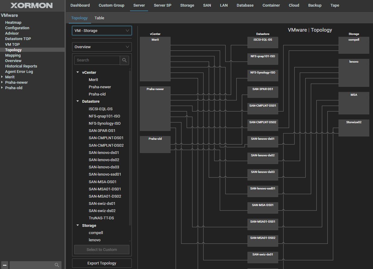 The Topology tool provides a graphical representation of logical connections between Virtual Machines, Datastores and Storage volumes.